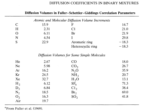 Natomiast parametr V jest dyfuzyjną molową objętością cząsteczki dyfuzyjnej obliczaną poprzez zsumowanie wszystkich molowych objętości dyfuzyjnych pojedynczychch atomów lub układów atomów. Te objętości dyfuzyjne przedstawia tabela: