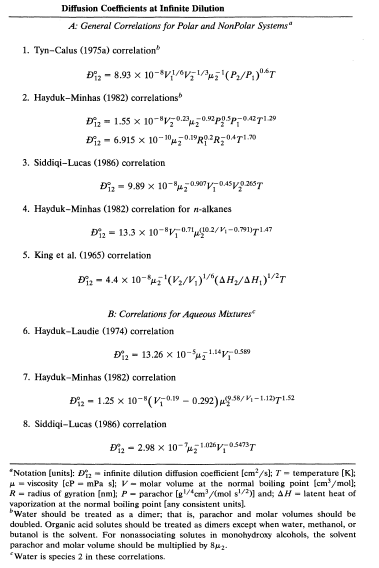 Sprawa dla cieczy jednak nie jest taka prosta. Wymaga ona obliczenia dyfuzyjności w warunkach nieskończonego rozcieńczenia, co odpowiada hipotetycznej dyfuzyjności dla energii Gibbsa bliskiej zeru. Taką korelację zapoczątkował Wilke i Chang, a rozwinęło wielu innych autorów dla różncych przypadków: polarności lub niepolarności składników.