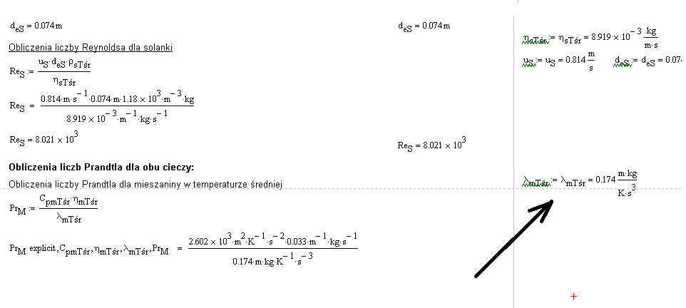Jak widać na pierwszym screenie wartość współczynnika przewodzenia ciepła nie została podstawiona właściwie. Zdarza się to dość często, mimo iż wcześniej ją obliczaliśmy. Moje rozwiązanie problemu przedstawia rysunek numer 2. Ponieważ boczne strony arkusza nie są przewidziane do druku wykonuje tam tak zwaną redefinicję zmiennych. Redefinicja współczynnika przewodzenia ciepła musi znajdować się przed samą definicją Prandtla, aby explicit mógł zrozumieć, że ma podstawić wartość współczynnika a nie wzór. Stąd, piszemy symbol współczynnika przewodzenia ciepla, podstaw...znów symbol współczynnika przewodzenia ciepła i KONIECZNIE "zwróć wartość". Całość jak już powiedziałem musi się znajdować przed definicją Prandtla. Jeżeli więcej niż jedna zmienna jest niewłaściwie podstawiana trzeba zrobić zabieg jej redefinicji ponownie. Przyczyn różnego podstawiania możę być wiele i wynikają one z wcześniejszych linijek arkusza. Ogólnie jest tak, że w forumule explicit mathcad do podstawienia pobiera ostatnią formułę definicji. Jeżeli definicja nie będzie zawierała na końcu zwrócenia wyniku mathcad za każdym razem będzie pobierał całą formułę. Jeżeli będzie wynik to wstawia go od razu.